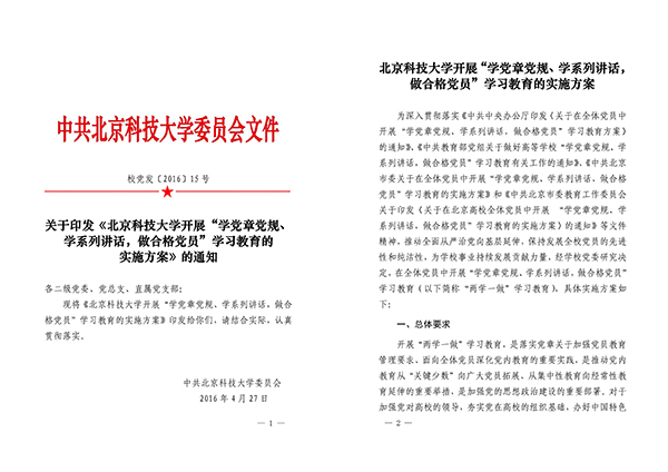 近日,北京科技大学“两学一做”学习教育工作领导小组办公室发布北京科技大学学生党员“两学一做”学习教育计划(以下简称《教育计划》...